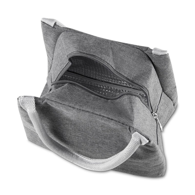 Bolsa térmica em tecido PET Reciclado com 2 compartimentos térmicos costurados, bolso frontal e alça de mão.
