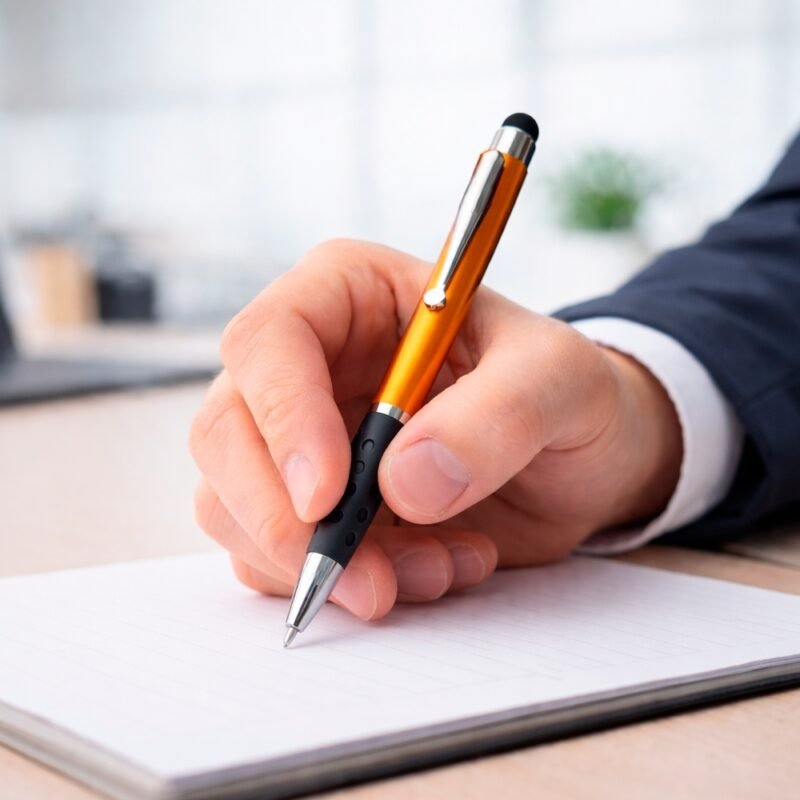 Caneta plástica com suporte para celular e touch screen.