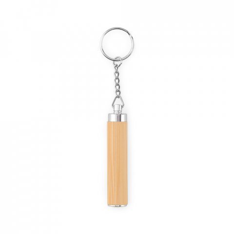 Chaveiro em bambu e ABS, com lanterna LED. Tem incluso 3 pilhas LR41. Fornecido em caixa presente de papel kraft. A cor e o resultado da impressão nos materiais naturais pode variar entre produtos.