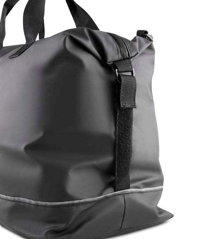 Mala esportiva em PU com revestimento interno em poliéster 210D. Possui faixa refletiva, bolso frontal com zíper, alça de mão e alça de ombro ajustável, além de dois compartimentos internos.