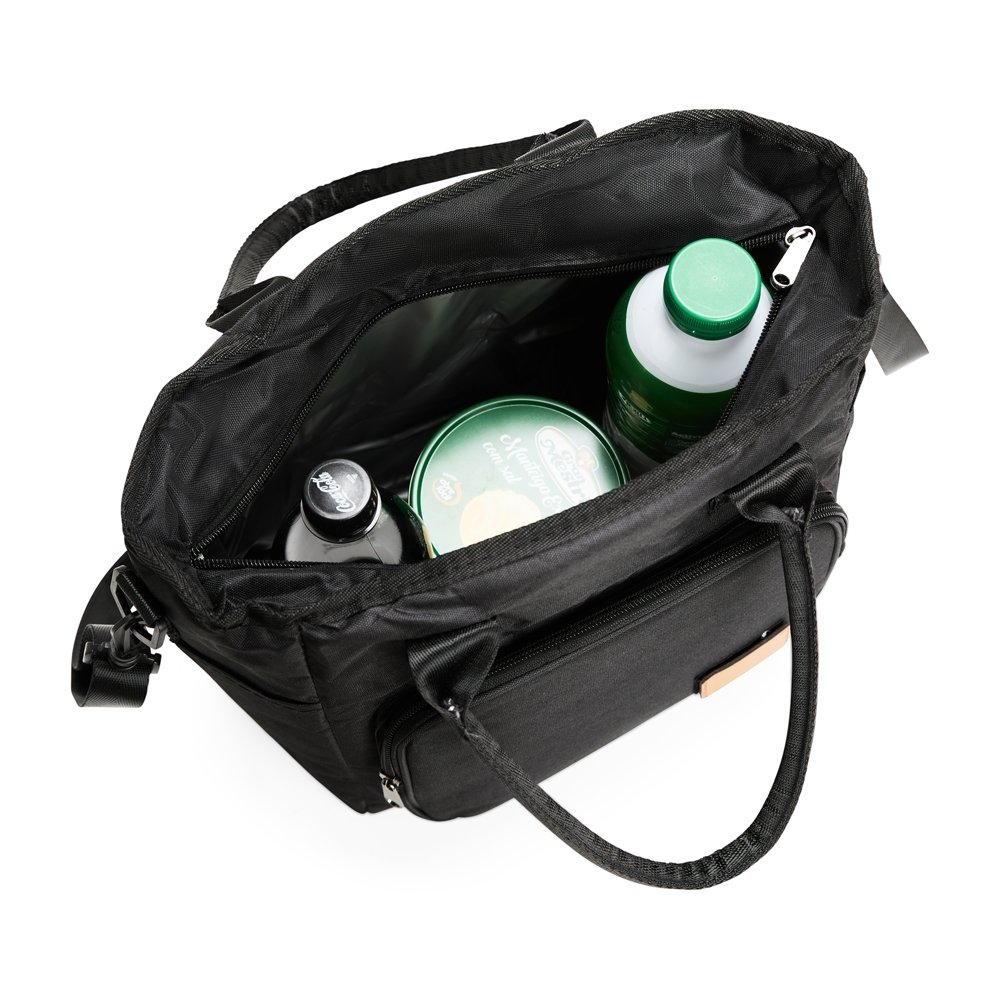 Bolsa térmica com capacidade de até 13 litros. Confeccionada em Oxford resistente à água, possui compartimento interno com revestimento térmico em PEVA e fechamento em zíper. Conta ainda com bolso frontal com plaquinha de couro sintético fixada com velcro, um par de bolsos laterais e duas alças fixas para transporte, além de uma alça transversal regulável com mosquetões para encaixe nas fivelas laterais da bolsa.