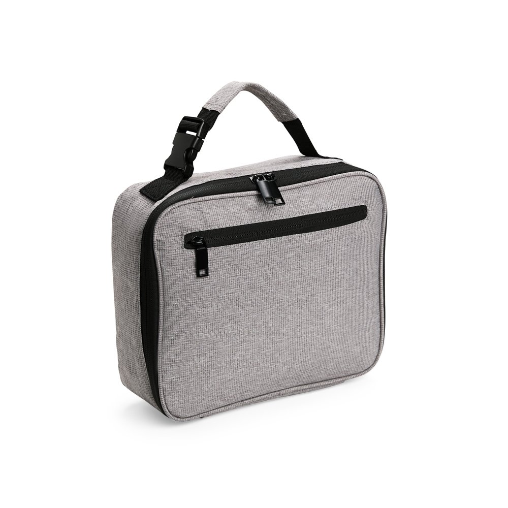 Bolsa térmica em poliéster impermeável com fechamento em zíper e capacidade de até 6 litros. Possui revestimento térmico interno em PEVA atóxico e compartimento em tela de nylon. Apresenta bolso frontal com zíper e bolso telado com elástico, além de alça de mão com engate rápido.