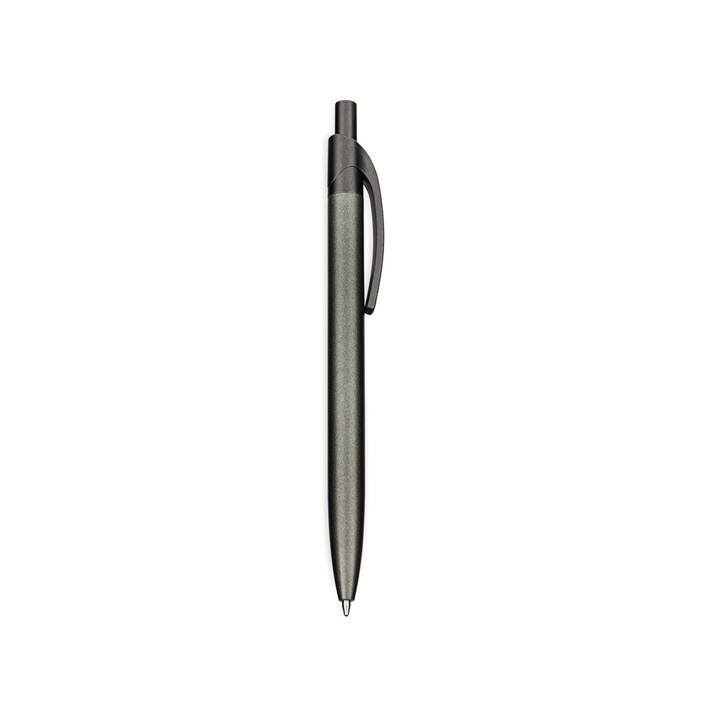 Caneta metálica com acionamento por clique e clip em plástico. Possui carga esferográfica azul de 1,0mm.