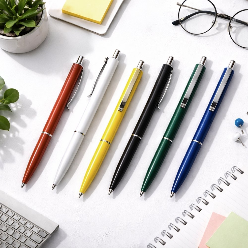 Caneta plástica com clip e ponteira em metal. Possui acionamento por clique e carga esferográfica azul de 1.0mm.
