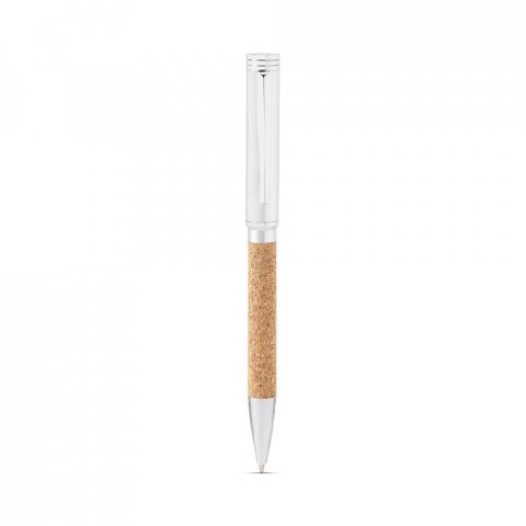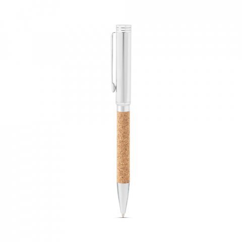 Conjunto composto por uma esferográfica e um chaveiro, ambos em metal e cortiça. A esferográfica tem clipe em metal, mecanismo twist e escrita em azul. Fornecido em caixa presente de papel kraft reciclado. A cor e o resultado da impressão nos materiais naturais pode variar entre produtos.