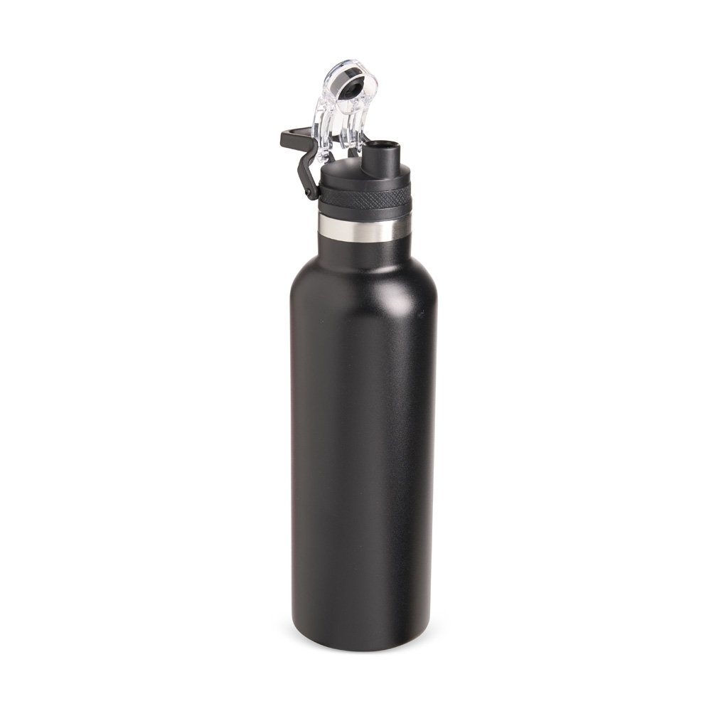 Garrafa térmica em inox 304 com capacidade de até 800ml. Possui estrutura de parede dupla e vedação a vácuo, permitindo conservar a temperatura de bebidas por mais tempo. Apresenta uma tampa rosqueável em plástico com protetor para o bocal e trava de segurança integrada à alça.