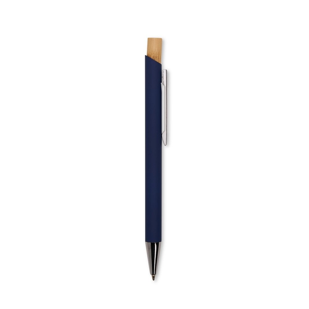 Kit executivo composto por uma caderneta e uma caneta. A caderneta possui capa dura, marca-páginas em fita de cetim e elástico para fechamento, além de aproximadamente 80 folhas com pauta. Por sua vez, a caneta metálica conta com detalhe em bambu, acionamento por clique e carga esferográfica azul de 1,0mm. Acompanha uma caixa.