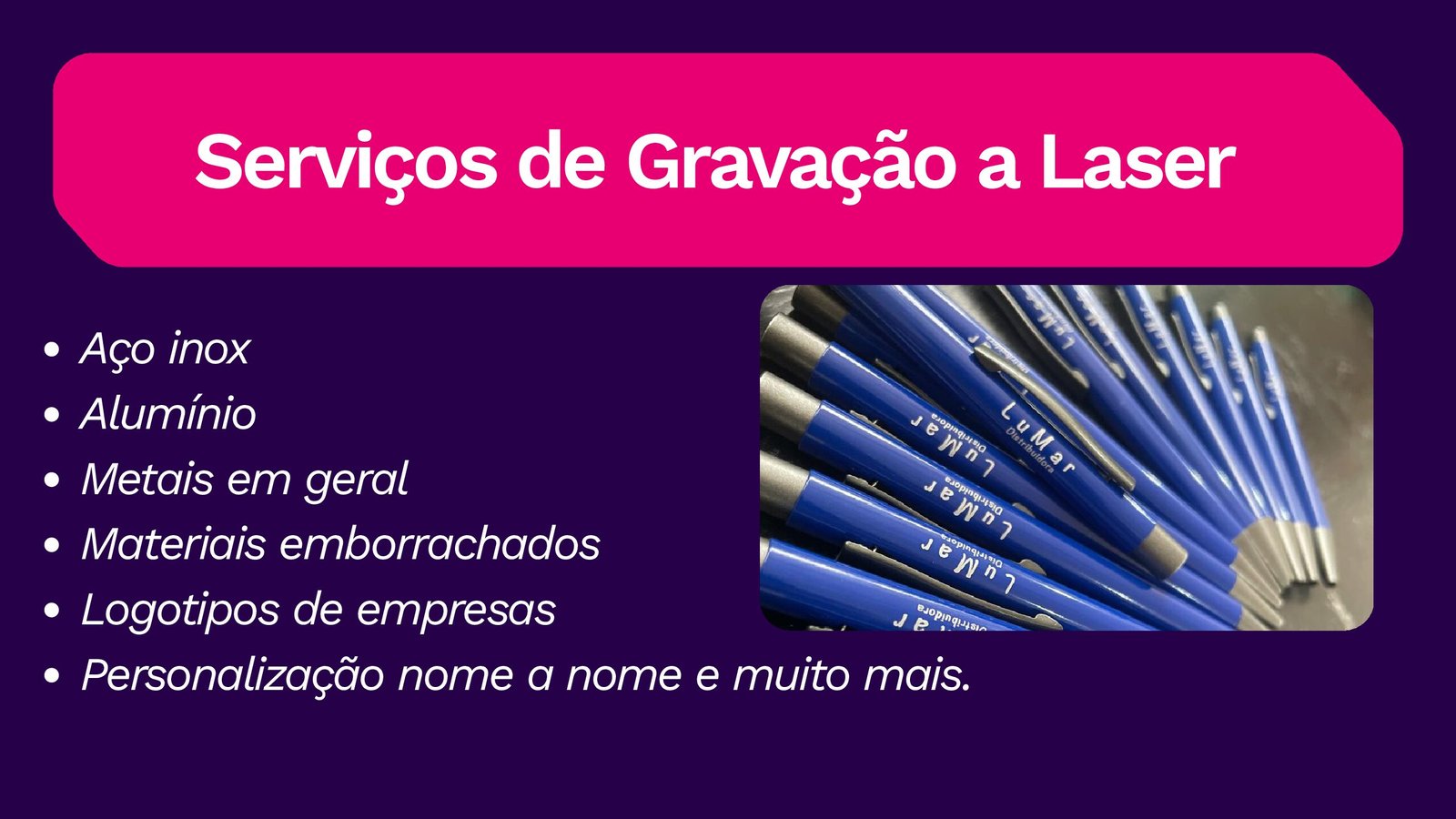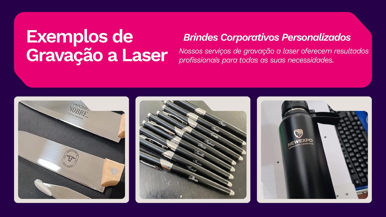 Precisão, tecnologia e acabamento impecável para personalização de alto nível. Somos especialistas em gravação a laser em metal, oferecendo soluções de personalização com alta precisão, durabilidade e padrão profissional para empresas, eventos e projetos corporativos.