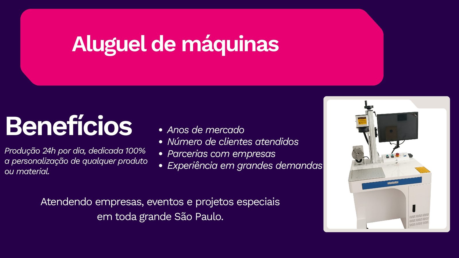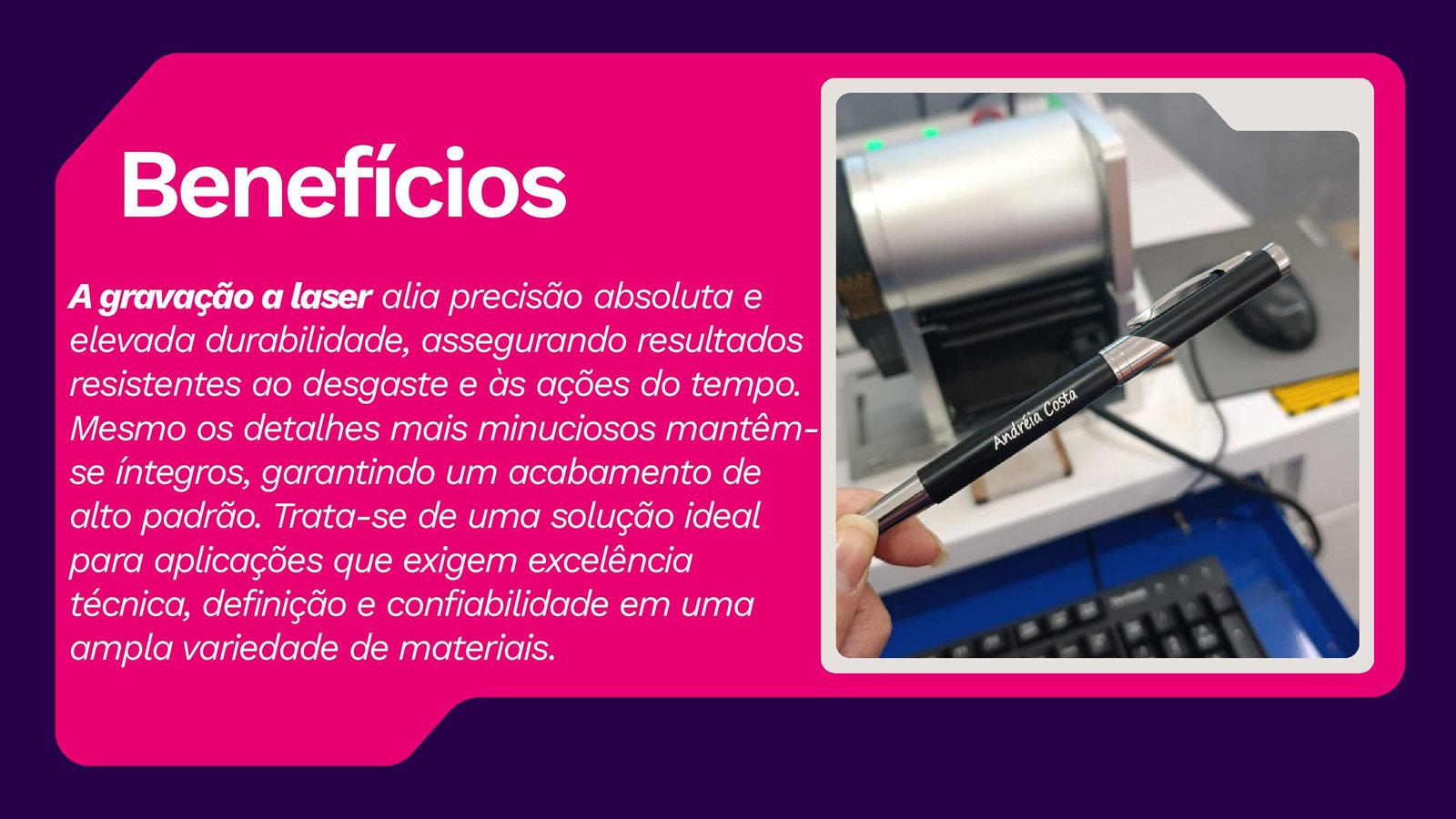 Além da gravação personalizada, oferecemos também o aluguel de máquina de gravação a laser para eventos, proporcionando uma experiência exclusiva e interativa, com personalização ao vivo para brindes, ativações de marca, ações promocionais e eventos corporativos