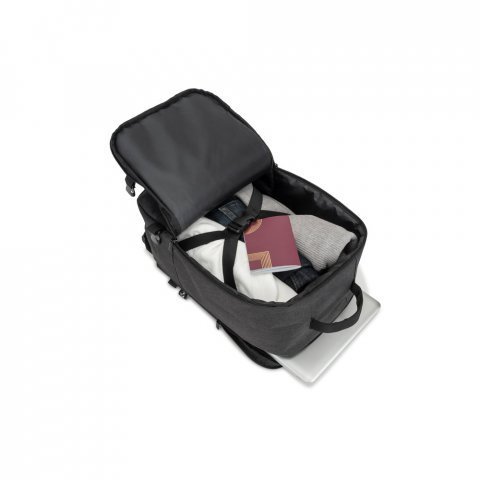 Mochila desenvolvida para cumprir as dimensões exigidas pelas companhias aéreas, permitindo-lhe viajar com tudo o que necessita como bagagem de mão. Composta em poliéster reciclado (rPET) 600D de alta densidade, com acabamento repelente à água, e forro em poliéster reciclado (rPET) 210D. Possui um compartimento principal amplo para roupa, um compartimento totalmente almofadado para um notebook até 14″ e um bolso frontal. A mochila oferece-lhe um maior conforto nas suas viagens devido à sua pega superior almofadada, cintas de compressão nas laterais que lhe permite ajustar a dimensão da mochila ao seu volume e a parte posterior em malha com alça para trolley. A parte frontal dispõe de uma peça para pendurar um objeto, como, por exemplo, um Squeeze com mosquetão. Capacidade até 20 L.