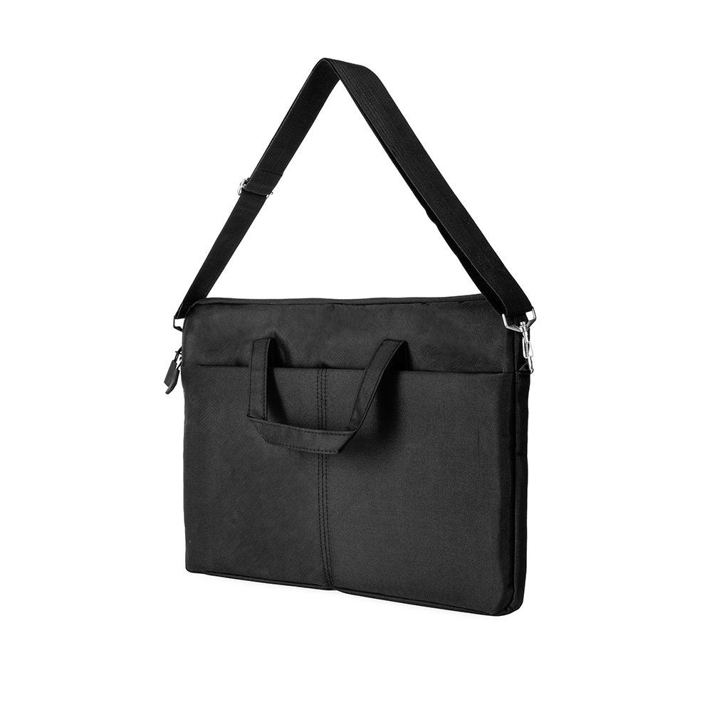 Pasta para notebook em poliéster impermeável, fechamento em zíper e capacidade para dispositivos de até 15,6 polegadas. Possui compartimento principal acolchoado e bolso frontal. Conta ainda com duas alças de mão, duas abas menores para encaixe de alça transversal removível e faixa posterior para acoplar em malas. Acompanha alça transversal ajustável.