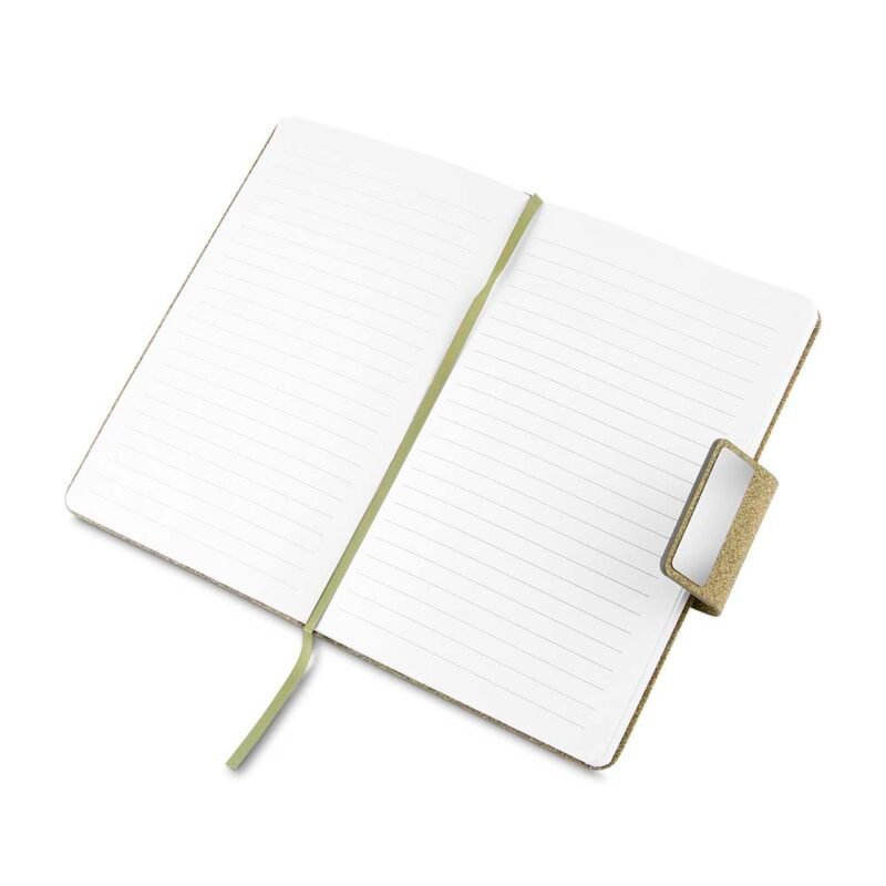 Caderno A5 com capa dura em cortiça e PU e 192 páginas pautadas em cor marfim. Contém elástico, fita separadora e suporte para esferográfica (não inclusa). Fornecido em bolsa de non-woven.